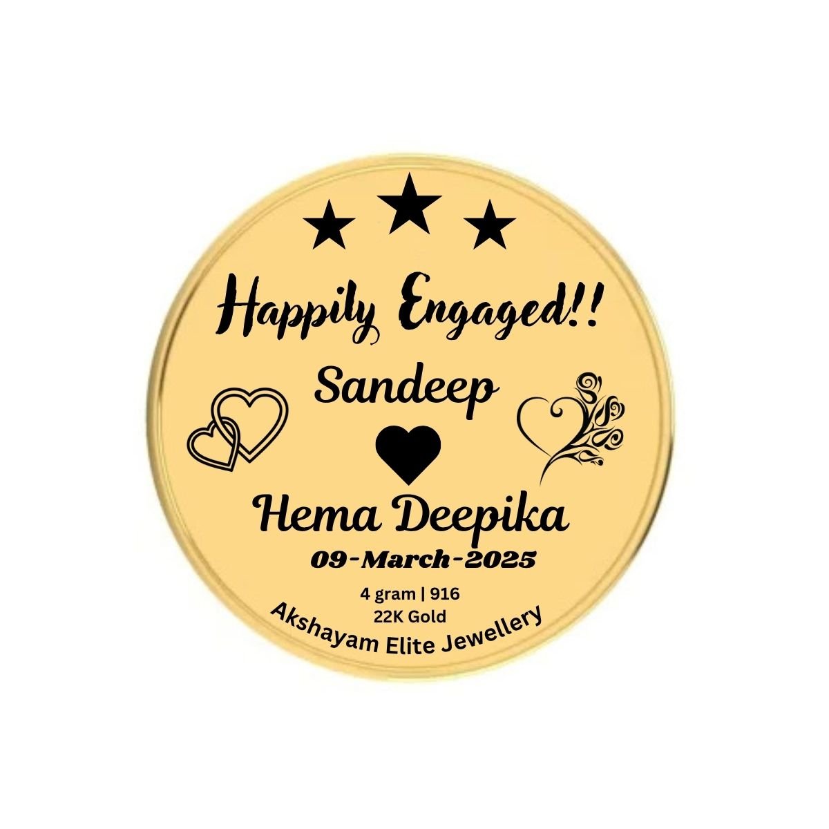 The Photo Engraved Gold Coin is made of pure?22K Yellow Gold?and comes with the?BIS Hallmark Certificate. We also provide a lifetime guarantee for the engraving of the photos, designs, and text and it is permanent in nature.